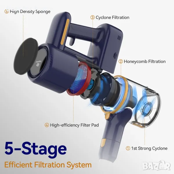 5-СТЪПЕННО ФИЛТРИРАНЕ - Безжична прахосмукачка с напълно запечатана филтърна система, за да поддържа чист и здравословен дом за вашето семейство. Има 2 степени на циклони за отделяне на по-големи отломки; след това филтърната подложка и филтърът на филтъра събират мръсотия и защитават двигателя (моля, уверете се, че използвате безжичната прахосмукачка с филтри); окончателното филтриране се извършва от гъбата с висока плътност във вакуумния двигател.