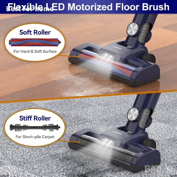LED МОТОРИЗИРАНА ЧЕТКА - Тази прахосмукачка за домашни любимци е оборудвана с гъвкава моторизирана четка за под. Светодиодните светлини на основната четка за под помагат за проследяване на прах и мръсотия в тъмните ъгли. Има два варианта на ролки: мека ролка както за твърд под, така и за килими с нисък косъм и твърда ролка за килими с къс косъм. Ролките приемат V-образен вълнообразен дизайн, събирайки прах и мръсотия по-ефективно от обикновената ролка.