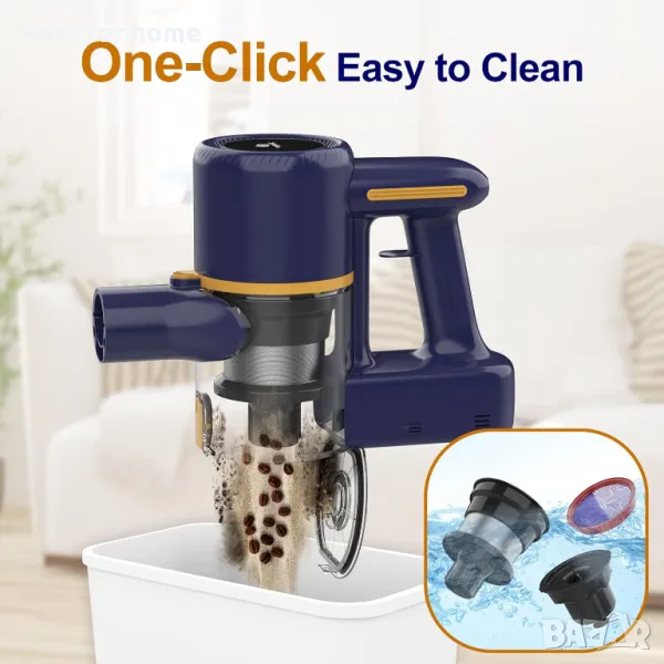 ЛЕСНА ЗА РАБОТА - Безжичната прахосмукачка е лесна за работа, няма кабел за дърпане или захващане. Управлението с върха на пръстите може да стартира вакуума или да превключва настройките за по-добро изживяване. Чашата за прах се изпразва лесно с едно щракване. Филтрите могат да се мият и да се използват многократно, моля, почистете филтрите, когато засмукването намалее и ги подсушете, преди да ги инсталирате отново. Приложен е резервен филтър за смяна.