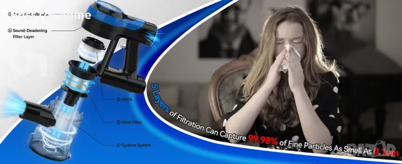 𝙋𝙤𝙬𝙚𝙧𝙛𝙪𝙡 𝙎𝙪𝙘𝙩𝙞𝙤𝙣 & 𝙎𝙪𝙥𝙚𝙧-𝙌𝙪𝙞𝙚𝙩: Безкабелната прахосмукачка с 200 W мощен мотор и 2 режима на засмукване, осигурява 20kPa мощност на засмукване при максимален режим, събирането на прах, отломки и косми от различни повърхности е лесно. Прахосмукачката също е доста тиха, с ниво на шум от около 60dB, което няма да безпокои вашите съквартиранти, домашни любимци или съседи𝙃𝙞𝙜𝙝-𝙀𝙛𝙛𝙞𝙘𝙞𝙚𝙣𝙘𝙮 𝙁𝙞𝙡𝙩𝙧𝙖𝙩𝙞𝙤𝙣 𝙎𝙮𝙨𝙩𝙚𝙢: Тази