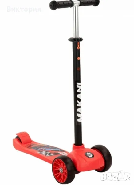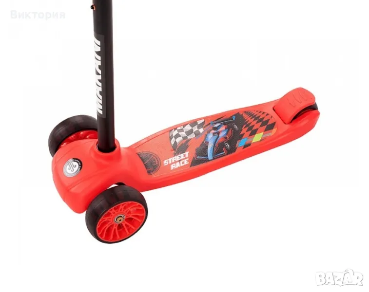 Нова в кашон Подходяща за деца над 3 години (до 50 кг);• Триколесен дизайн;• Големи и стабилни гуми; • Компактна в сгъната позиция;• LED гуми;• Задна спирачка;• Регулиране височината на кормилото в 3 позиции от 70 до 80 см;• Противоплъзгаща се основа;• Меки гумени ръкохватки.
