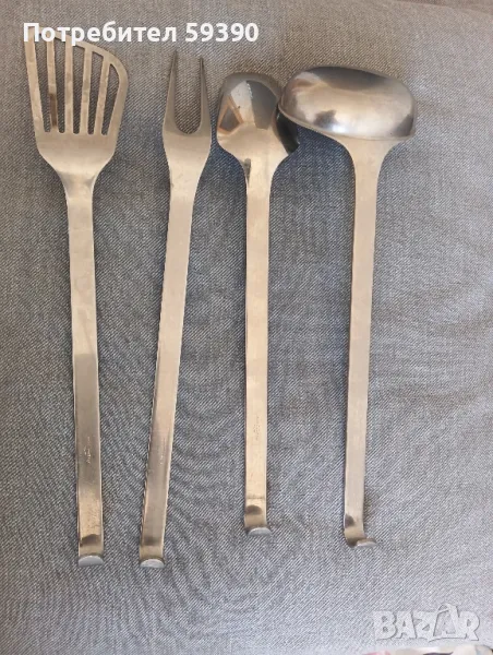 Използвани масивни прибори , неръждаеми италиански. Дължина от 35-40 см. Имат следи от употреба,но са много здрави. Със сигурност ще ги оставите в наследство. Цена за брой:22 лева. Лопатката има лек нагар(вероятно е била в близост до огъня),иначе не и пречи на употреба.