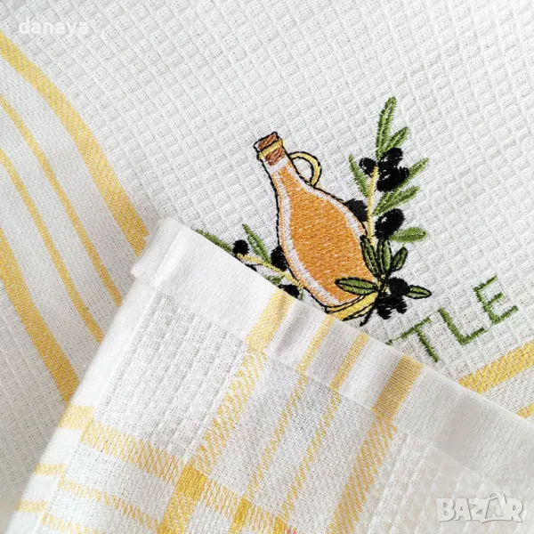 С размер 64×37 см, тя е идеална за подсушаване на ръце, избърсване на кухненски повърхности или подсушаване на съдове. Белият фон с жълти райета придава слънчево настроение, а декорацията с бутилка зехтин и маслини носи уютен средиземноморски чар.