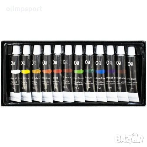 Маслени бои MAX, 12 цвята, В туби. Подходящи за употреба у дома, в училища и детски градини. Произведени от висококачествени материали. Живи и ярки цветове, отлична покривна способност и висока плътност на цветовете. Нетоксични. Обем туба - 12 мл. Тегло за комплект - 250 г. Размери опаковка - 25х10.5х2 см.