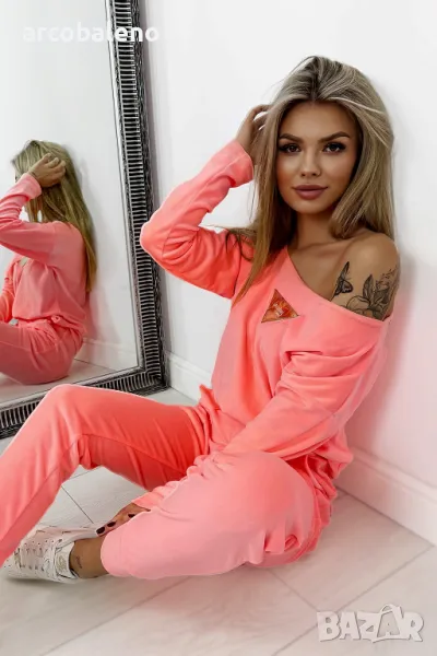 Дамски комплект от кадифе с удобни ластични панталони е идеалният избор за всеки ден. Свободна блуза, която можете да носите от рамото, съчетава стил с комфорт. Златната лепенка на суичъра и панталона придава елегантен характер на цялата визия.