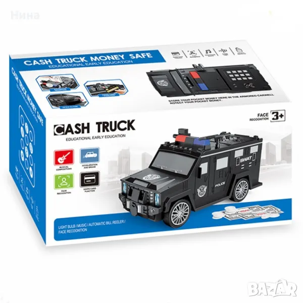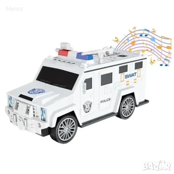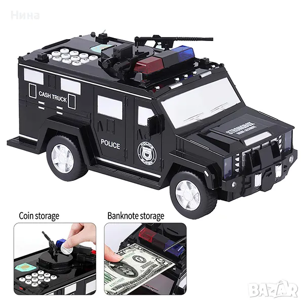 Полицейската кола- касичка инкасо приема и монети и хартиени банкноти.