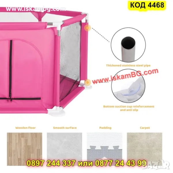Осигурете на вашето дете безопасно и забавно място за игра с розовата шестоъгълна кошара. С нейния стабилен и надежден дизайн, тя ще предостави сигурност на малчугана, докато играе и изследва света около себе си. Кошарата е идеална за вътрешна употреба и предлага пространство за безопасна игра, без да се налага постоянно да следите всяко движение.