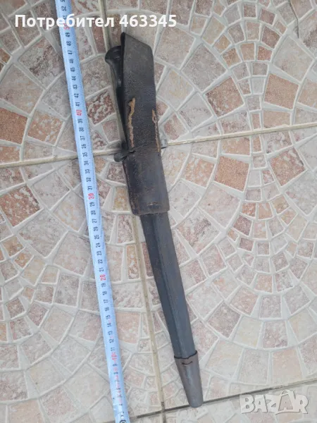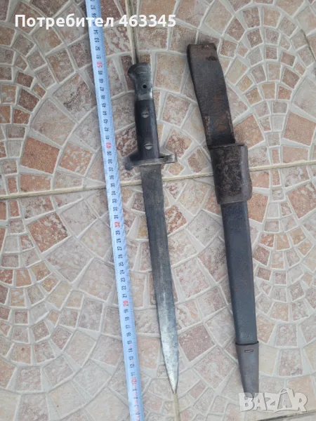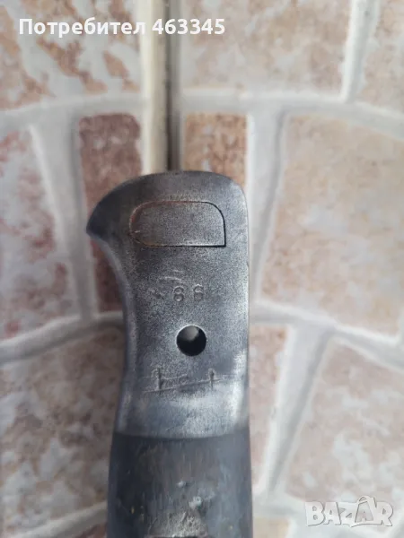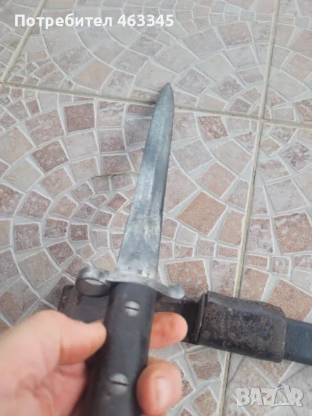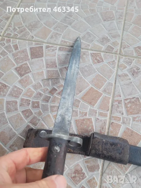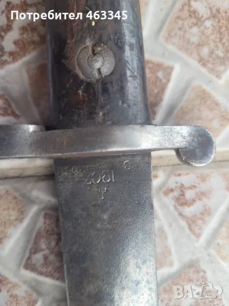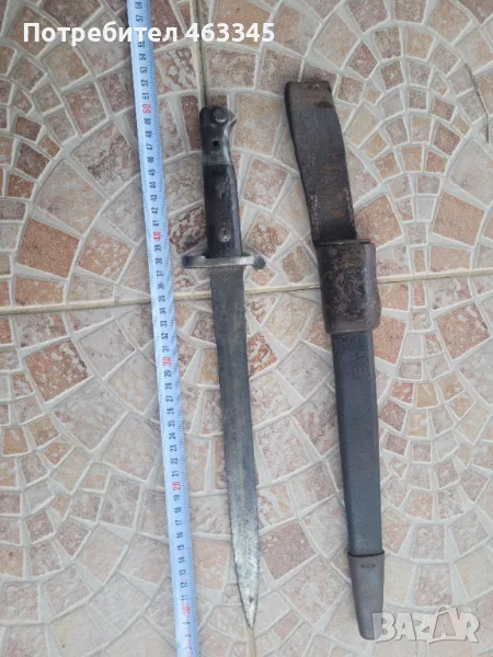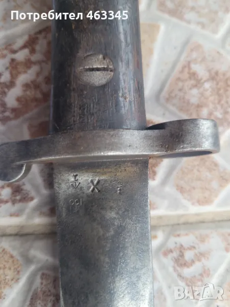 Британски щик от Първата Световна Война. Продава се с оригинална кожена ножна с лопус. По нея има следи от ремонт, но няма късано или разшито. Самият щик е с множество маркировки, непочистван и незаточван. Много добро острие без подбитости. Чирените са в добро състояние, бутонът работи