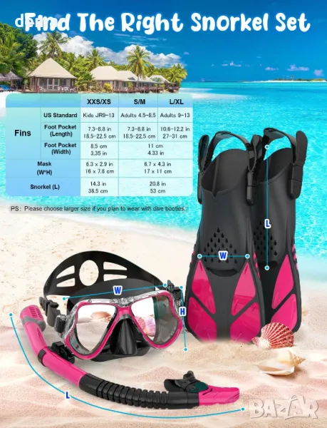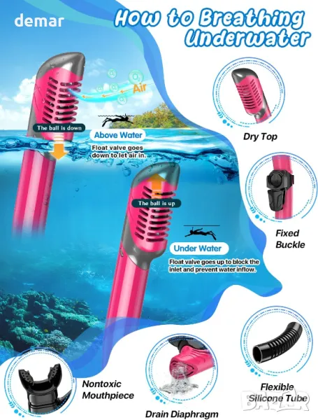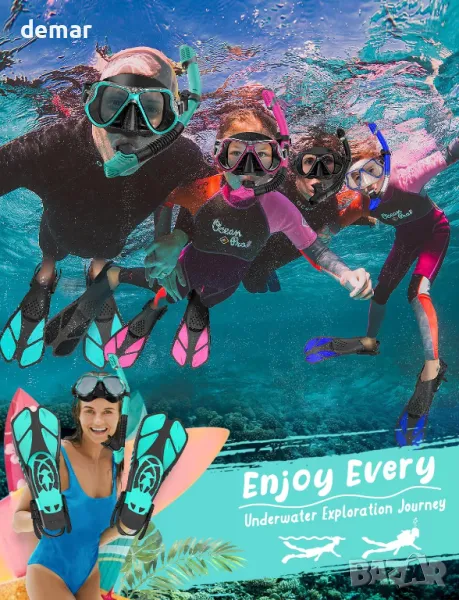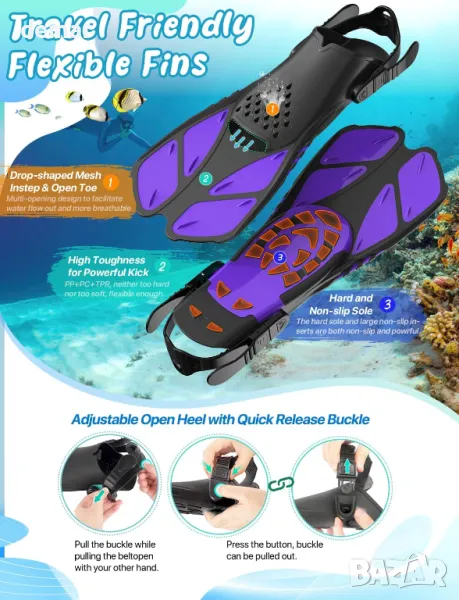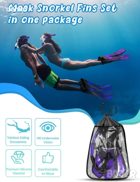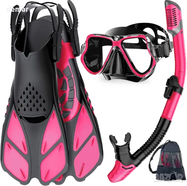 Този комплект за шнорхел 3 в 1 включва маска за гмуркане с панорамна гледка и закалено стъкло против замъгляване, шнорхел със сух горен край с механизъм за блокиране на водата и дренажен клапан за лесно дишане, както и гъвкави плавници с регулируема каишка и катарама за бързо освобождаване за подобрен комфорт и ефективност. Меката силиконова пола на маската осигурява водонепроницаемо прилягане, а ергономичният мундщук за шнорхел добавя комфорт. Включена е бързосъхнеща мрежеста чанта за удобно съхранение и транспорт.