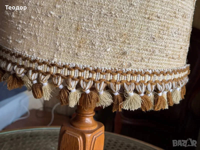 Това е винтидж нощна лампа или настолна лампа с дървена основа и абажур, изработен от тъкан материал с декоративни ресни. Този стил беше популярен в средата и края на 20-ти век, особено в класически или рустикални интериори.