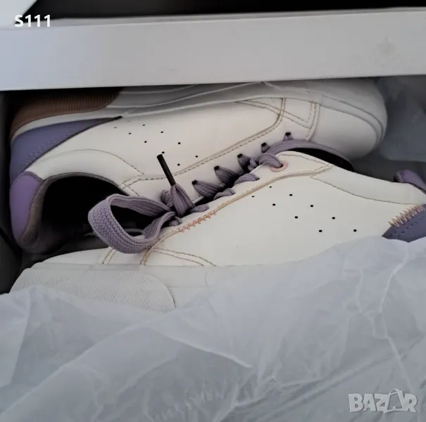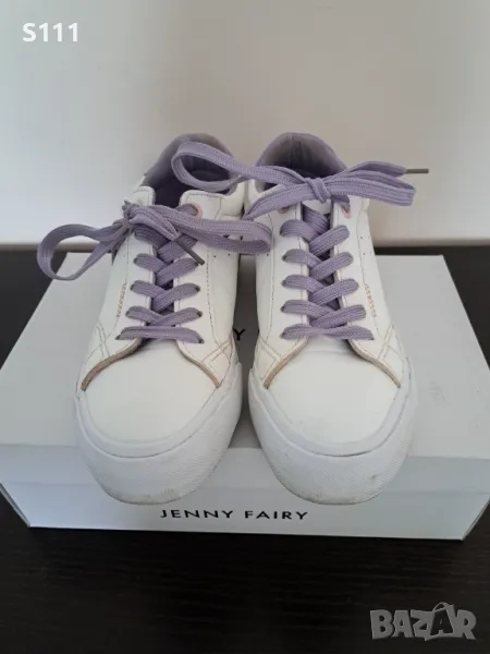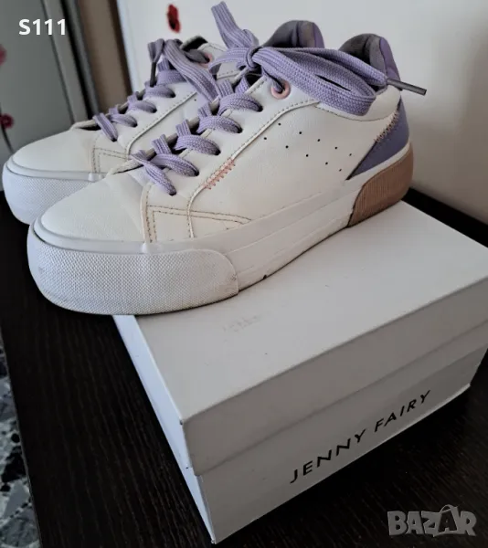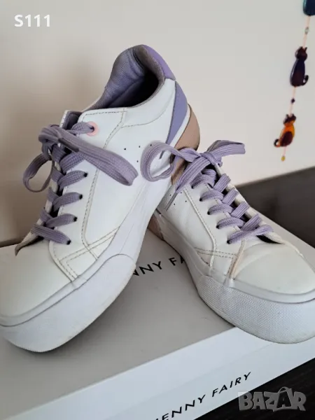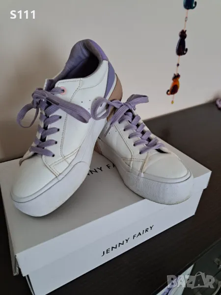 Ефектни, много удобни и практични дамски кецове Jenny Fairy. Бели, с елементи в бежово и люляково. Носени са три пъти, нямат никакви забележки, в отлично състояние. Дължина на стелката 23.6 см.