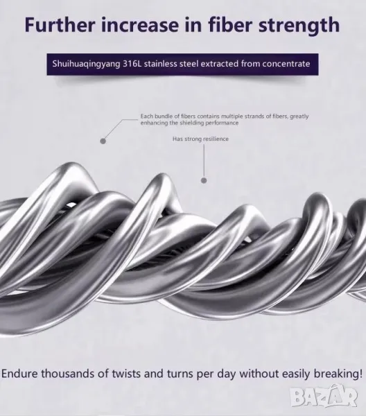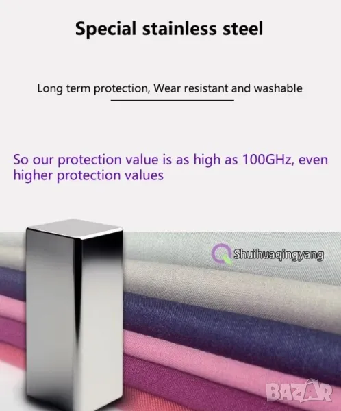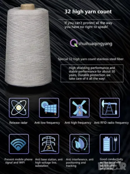 Анализ на тъканта от метални влакна: Изработена от стоманени нишки от неръждаема стомана 316L, извлечена от концентрат, тя е била непрекъснато накисната в морска вода в продължение на 72 часа, за да подобри своята проводимост, устойчивост на солен спрей и устойчивост на корозия, което води до степен на екраниране до 99,9%. Всеки пакет от влакна съдържа множество нишки от влакна, които ефективно екранират високите и ниските честоти, с екранираща производителност до 100GHz. В същото време металните двойни нишки се комбинират, за да образуват вторична сила и се подлагат на хиляди експерименти за огъване всеки ден, за да се подобри здравината на металните влакна. След серия от сложни процеси, той се смесва с 50% чист памук, за да се получат 32 нишки с висока прежда, което прави целия сноп от влакна по-удобен и стабилен в изпълнение. Има дълготрайна защита, устойчивост на износване, устойчивост на пране, може да се пере в пералня и плътно приляга.