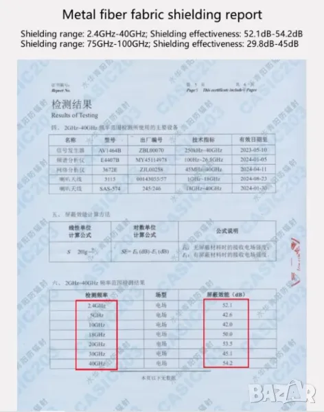 Обхват на защитно екраниране при следните честоти: 2GHz-40GHz с ефективност на защитното екраниране: 52.1dB-54.2dB.