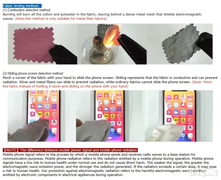 (1) Метод за откриване на горене: Изгарянето ще изгори целия памук и полиестер в тъканта, оставяйки след себе си плътна метална мрежа, която екранира електромагнитните вълни. (Забележка: този метод е подходящ само за тъкани от метални влакна).