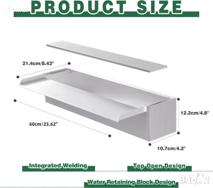 Изработен от полирана неръждаема стомана за издръжливост и устойчивост на ръжда, този водопад за езерце се отличава с елегантен дизайн с отворен връх и двойни входове за вода отзад и отдолу. Поддържа интеграция с LED лента за по-добра атмосфера (LED лентата и помпата не са включени), с вграден кабелен улей за лесна настройка. Лесен за инсталиране с PVC конектор, работи най-добре с помпа 4500L/H ±15% и филтър за налягане или поток за поддържане на чиста вода. Подходящ за рибни езера, градински басейни, дворове и потоци.