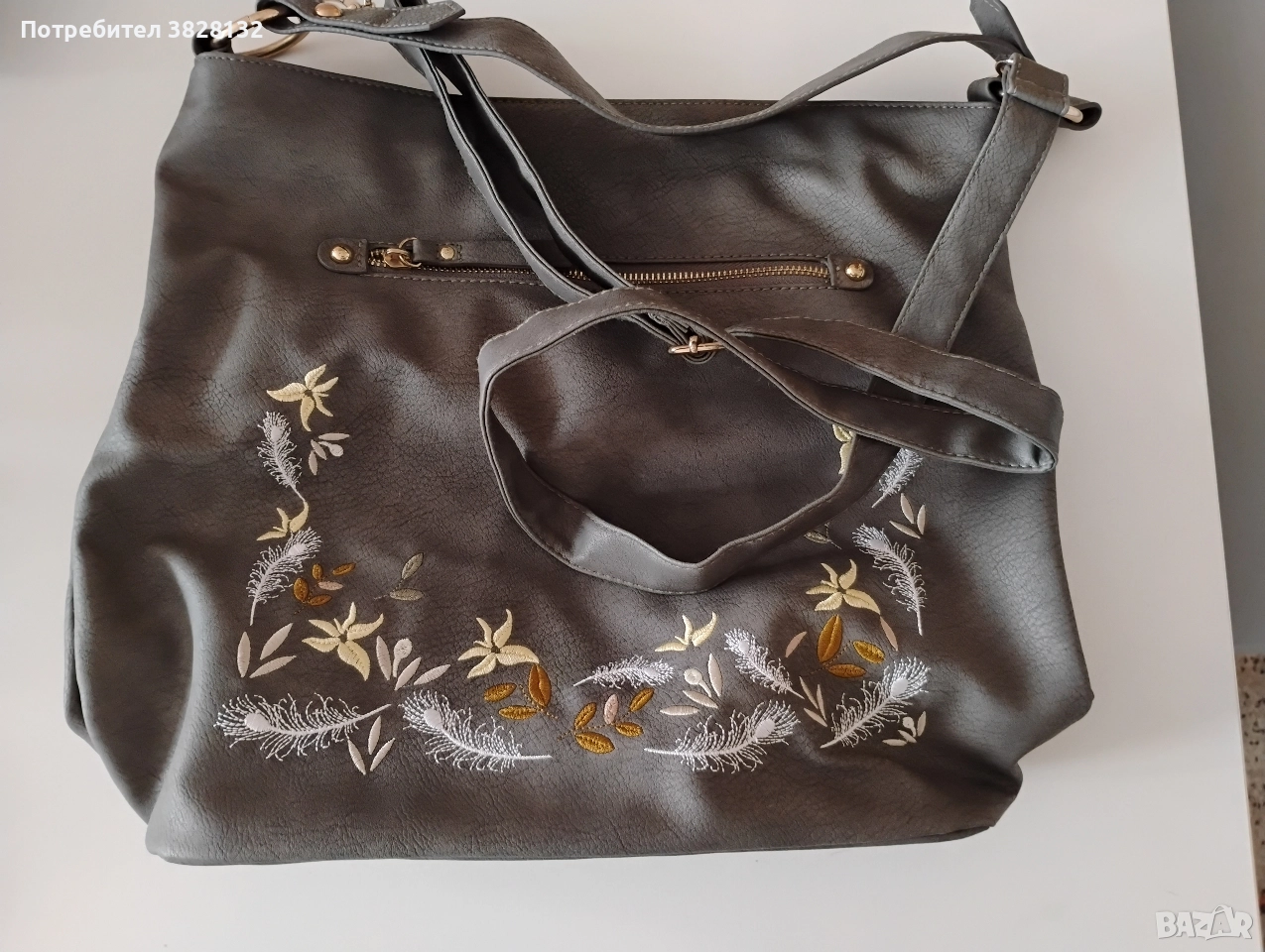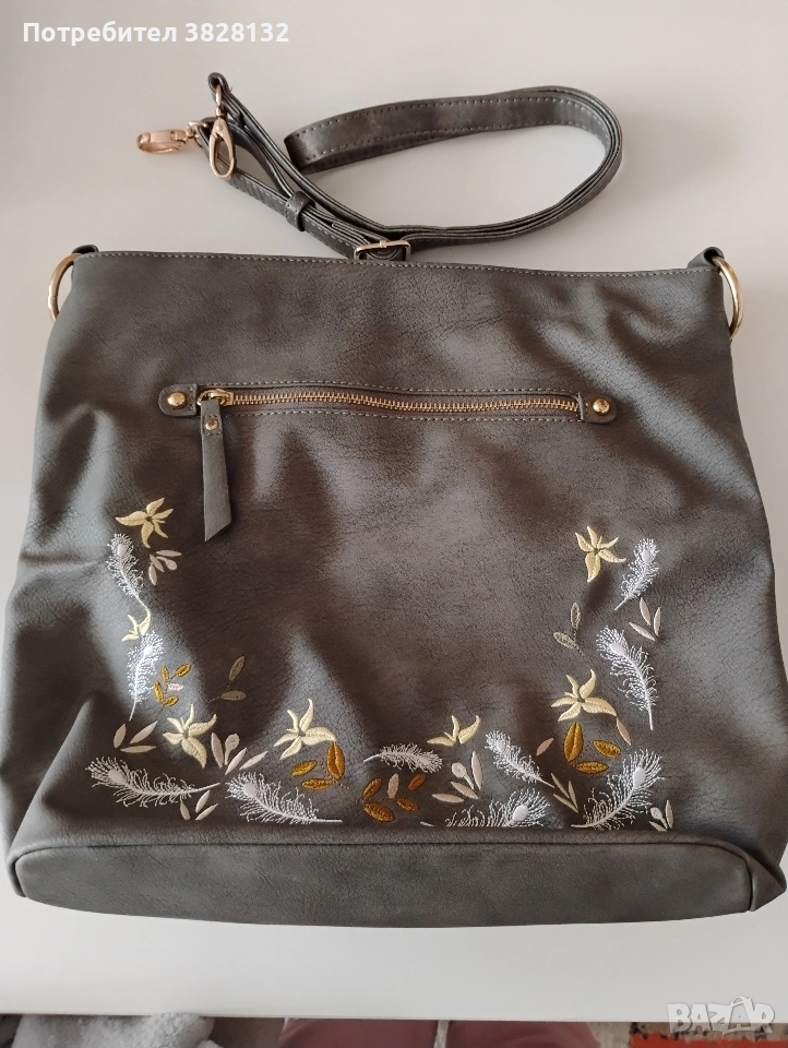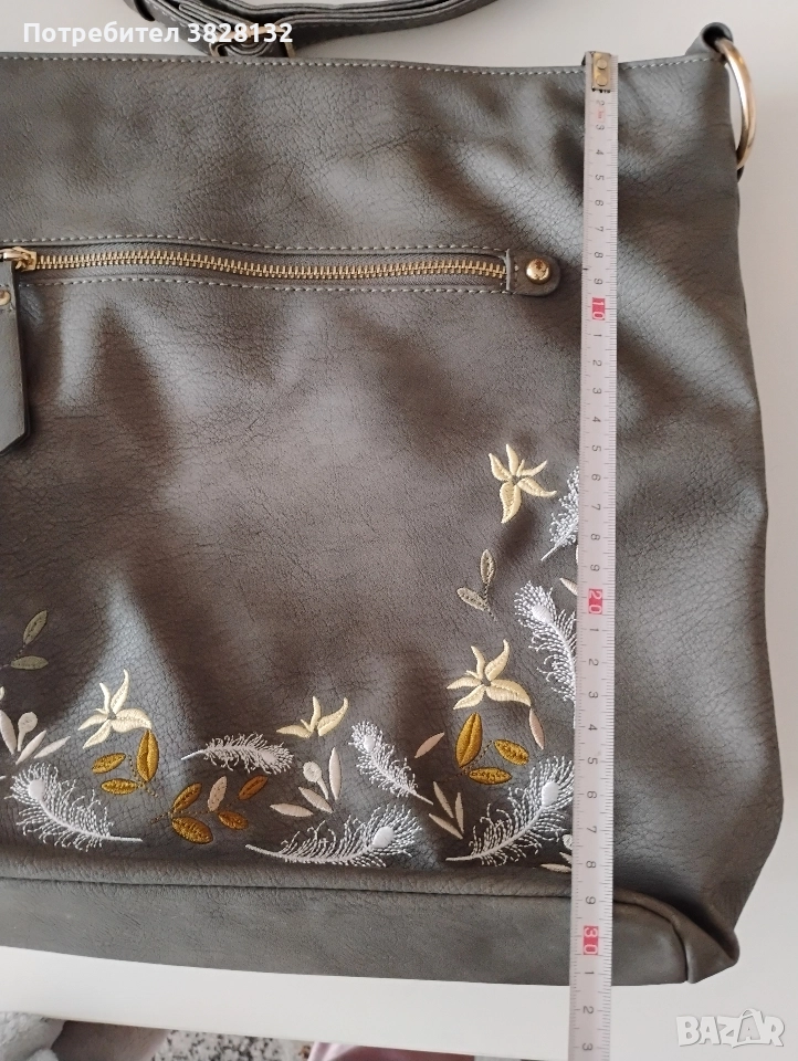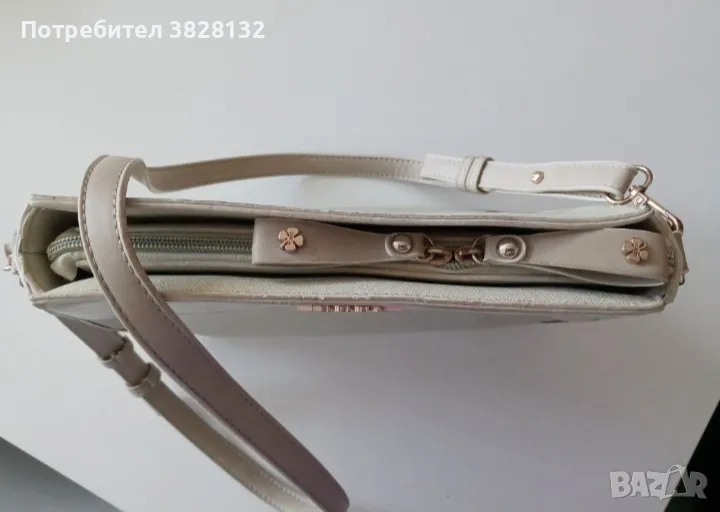 2.Дамска чанта, цвят слонова кост, за през рамо в бяло със златисти закопчалки -цип, и декоративни детайли. Цена 20лева.
