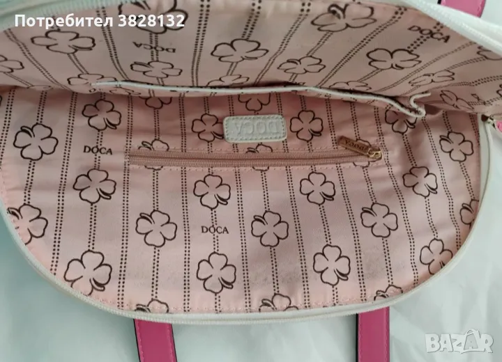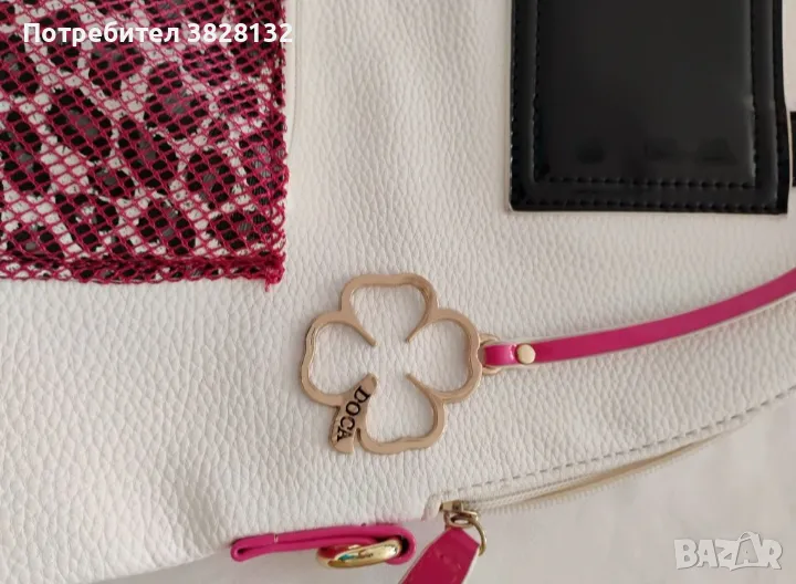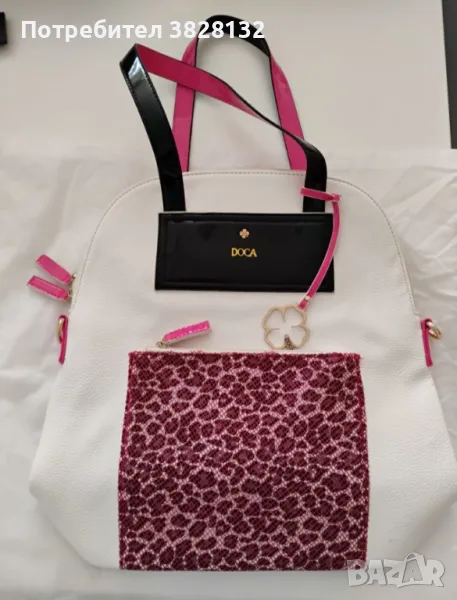 1.Дамска чанта, бяла с розово-черни къси дръжки и външен джоб леопардов принт, нова. Цена 30 лв.