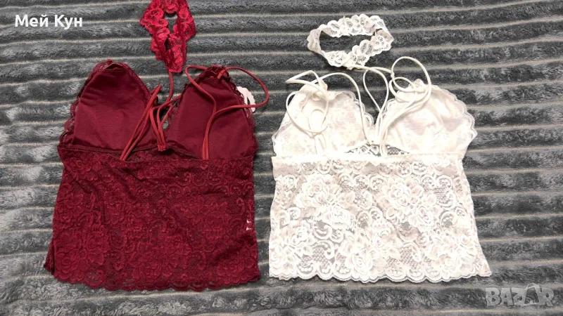 Червеното бюстие е с подплънки, а бялото - без подплънки. Дължината им е 30 см, с чашка А размер! Цена 12 лв/ бр.