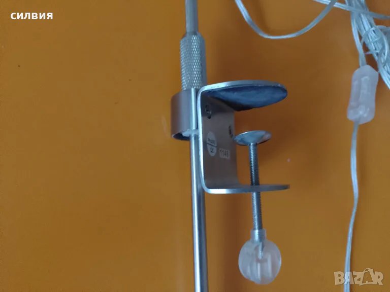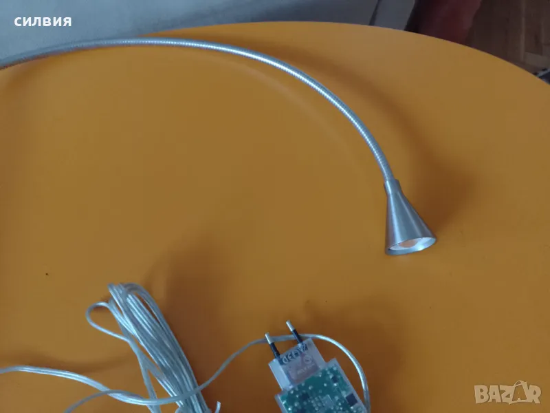 настолна лампа със скоба и гъвкаво рамо , работеща , няма забележки , височината на снимката е 30 см. , но може да се коригира от гъвкавото рамо