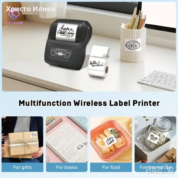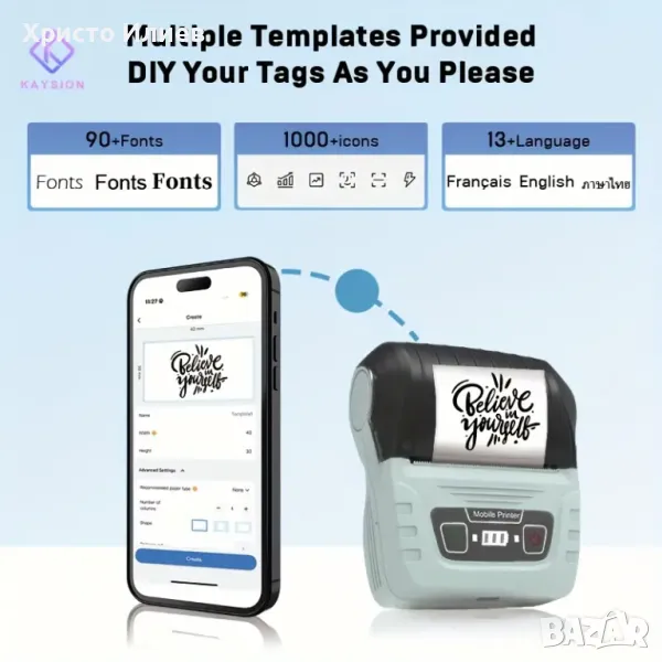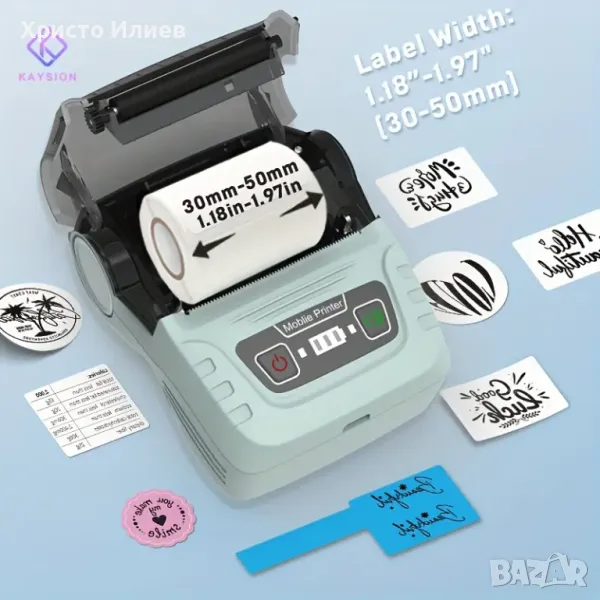 - Мини Bluetooth безжичен термомобилен принтер за етикети, който може лесно да се свърже с вашия телефон. Нашето приложение има много интересни и практични шаблони, които ви позволяват лесно да отпечатате всеки етикет, от който се нуждаете, включително етикети за дрехи, етикети с цени, етикети за кабели, етикети за бижута, етикети за папки и други. Диапазонът на ширината на етикета е 30 mm~50 mm, а максималната ширина за печат е 50 mm. Този продукт е преносим Bluetooth принтер за етикети и не е подходящ за изпращане на етикети