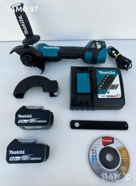 Макита с потенциометър за регулиране на оборотите. С комплекта никога не е работено, беше като мостра, производство от 2024г. внос от Франция. Комплекта включва ъглошлайф с предпазител, ръкохватка, гайки, ключ за смяна на диск, 2 броя батерии по 18V 5.0Ah с индикатор, бързо зарядно и оригинален куфар.
