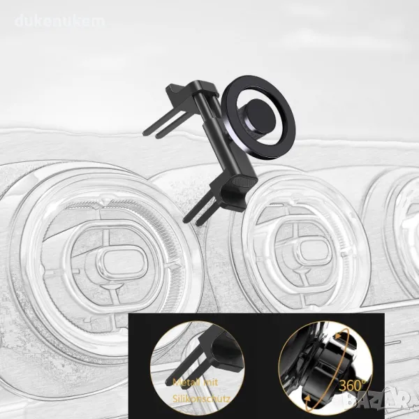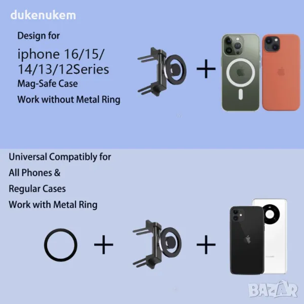 Съвместим с MagSafe – директно поставяне на iPhone 12 и нагоре без нужда от метална пластина. За други телефони – включен метален пръстен.