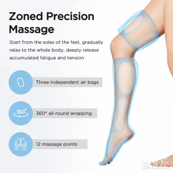 4. Три независими въздушни възглавници за бедрата, прасците и стъпалата, 12 внимателно проектирани точки за масаж, 360° всеобхватен масаж, започващ от стъпалата, постепенно отпускащ до цялото тяло, дълбоко освобождаващ натрупаната умора и напрежение.