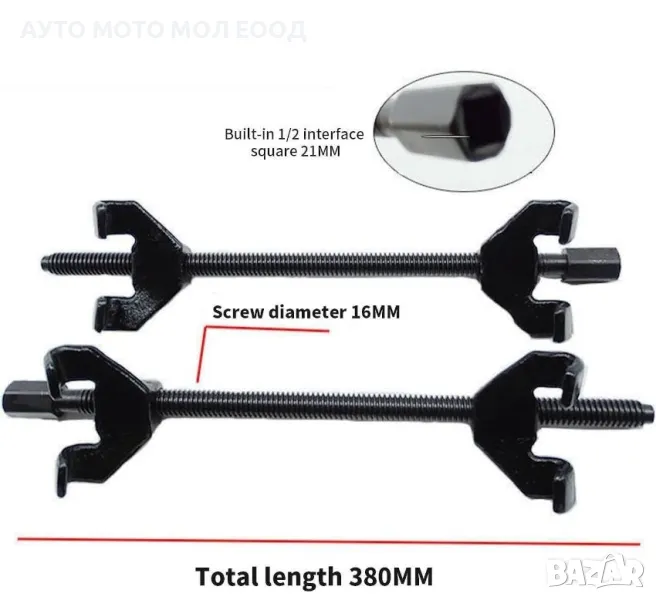 скоби за пружини на амортисьори са с обща дължина 380 мм и работен обхват 82 - 380 мм. Имат фина резба, която улеснява работата при пружинно натоварване.