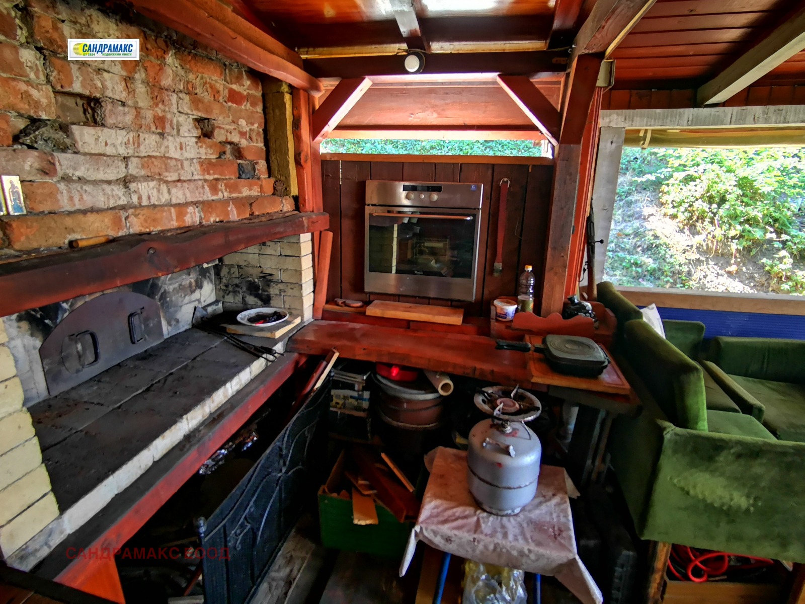 Конструкция : Къщата е строена около 2000 г.. Тухлена сграда с железобетонна конструкция и тухлени стени. Покривът е с бетонова обшивка до таваните на стаите на втория етаж. Скатната част на покрива над бетоновата конструкция е с топло и хидроизолация и керемиди. Сградата е изцяло обшита с изолация.. Дограмата е с троен стъклопакет PVC, кафява, четири сезона , висок клас. Дневната част и стаите са с витрини до пода на помещенията за много светлина.