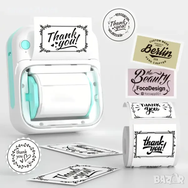 - Мини Bluetooth безжичен термомобилен принтер за етикети, който може лесно да се свърже с вашия телефон. Нашето приложение има много интересни и практични шаблони, които ви позволяват лесно да отпечатате всеки етикет, от който се нуждаете, включително етикети за дрехи, етикети с цени, етикети за кабели, етикети за бижута, етикети за папки и други. Принтер с Ролка Термо Трансферни Етикети 50x50мм