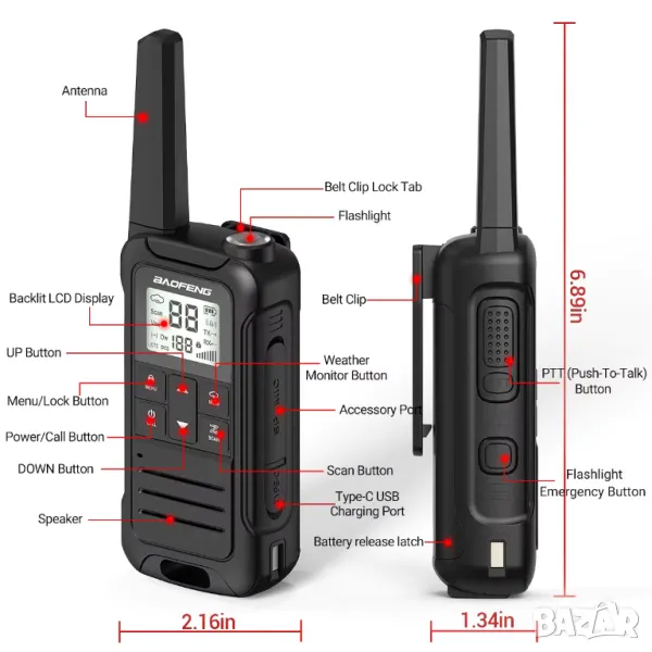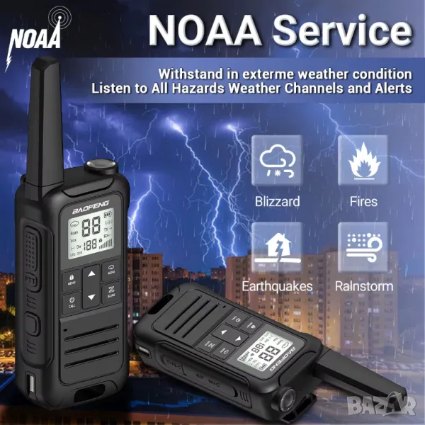 【Сигнал за времето на NOAA (само за САЩ)】 Уоки токито поддържа услугата за времето на NOAA. Може да сканира 12 метеорологични канала на NOAA. Когато включите функцията за аларма за времето, двупосочното радио ще даде аларма, ако има риск от лошо време. Дава ви достатъчно време за справяне с бедствия като торнадо, урагани, гръмотевични бури, наводнения, земетресения и др. Това е необходимост за безопасността на живота.