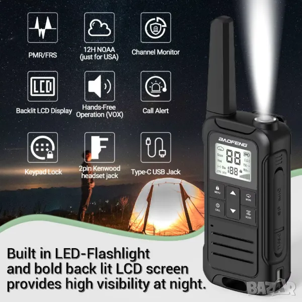 【Многофункционален】Голямото фенерче отговаря за вашето нощно осветление, преносимото двупосочно радио frs има аларма за времето, която е подходяща за вашето пътуване на открито, а също така има 22 канала, режим на двоен мониторинг, сканиране на канали, 155 кода за поверителност, функция за повикване и 8 опции за тон на звънене, функция за свободни ръце VOX и HD аудио качество, както и заключване на клавиатурата, LCD дисплей с подсветка, звуков сигнал за изтощена батерия, 2-пинов жак за слушалки Kenwood, Type-C USB конектор за зареждане.
