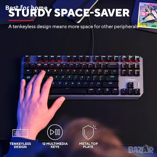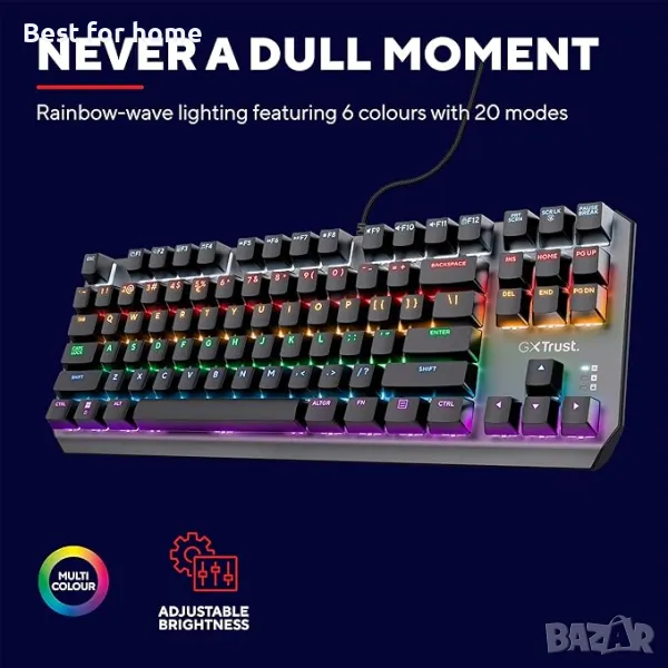 Механична геймърска клавиатура Trust Gaming GXT 834 Callaz TKL с UK оформление, компактен дизайн без ключ (80%), превключватели Outemu, многоцветно LED осветление, USB механична клавиатура за компютър, лаптоп, Mac