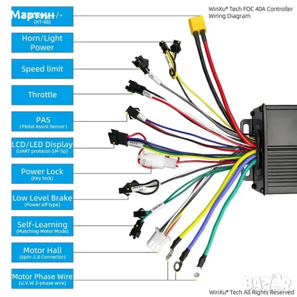 Този контролер е подходящ за електрически скутери, както и за електрически велосипеди, той е много съвместим и предназначен за потребители на модификации и сервизи.