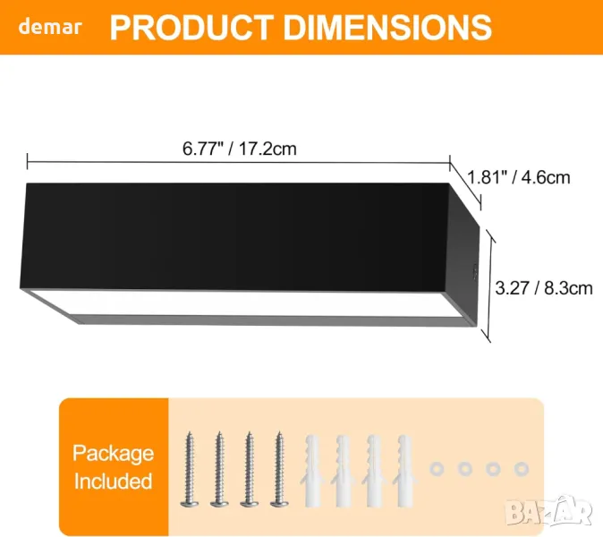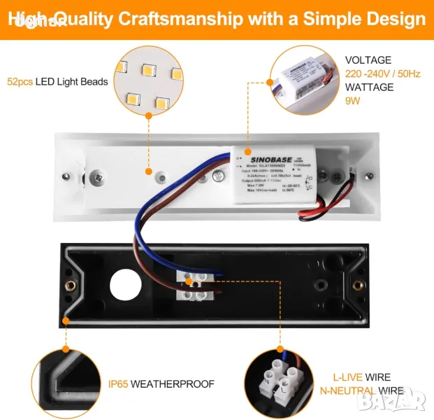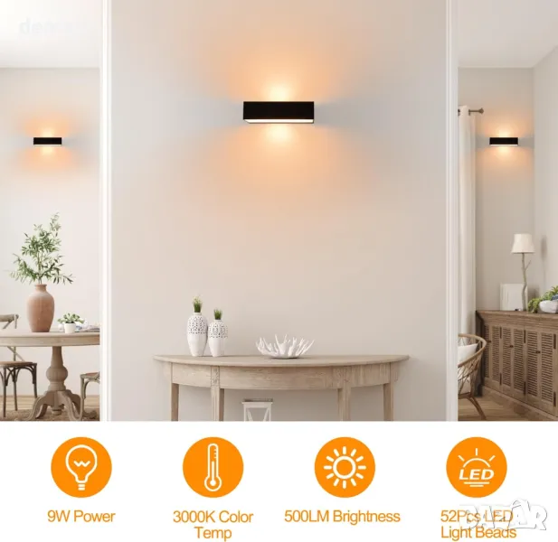 Изработена от издръжлива пластмаса с елегантен, модерен дизайн, тази стенна лампа допълва както вътрешни, така и външни пространства, като същевременно осигурява ярка, мека топла бяла светлина. С водоустойчивост IP65, тя издържа на дъжд, сняг и слънце, без да ръждясва или да избледнява. Енергийно ефективната вградена LED светлина с мощност 9W излъчва 500 лумена равномерно осветление нагоре и надолу, създавайки уютна атмосфера. Монтажът е бърз и лесен с включените аксесоари и ясни инструкции. Идеална за вътрешни дворове, веранди, стълбища, бани и други, тя предлага както функционално осветление, така и декоративна привлекателност.