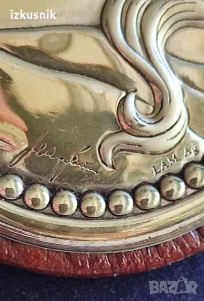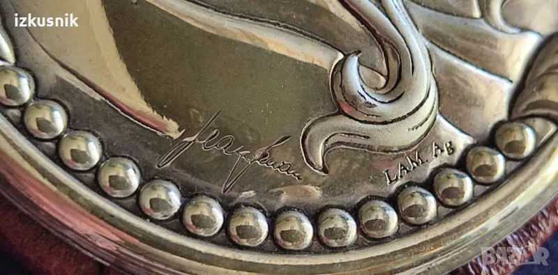 Много изящна и красива старинна сребърна или посребрена пластика - барелеф. Авторска изработка, с подпис и означение за вида на материала – сребро. Щемпелът е LAM Ag с подпис на автора, първото име на когато разчитам като Jean….. /Жан……./ Ако някой помогне за разчитане на цялото име, ще бъда благодарен!