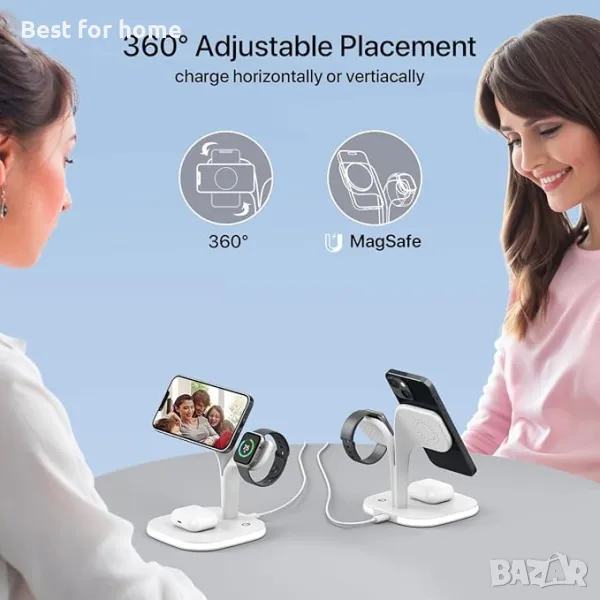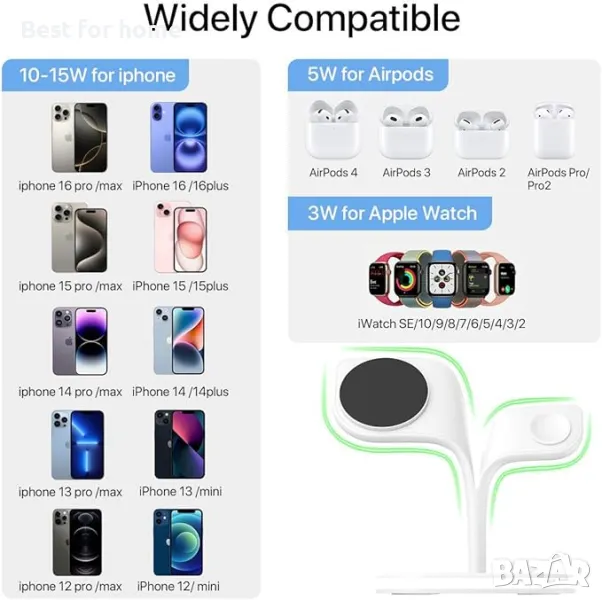 【Apple Mag-Safe Charger】 Опитът с антимагнитно подравняване е достъпен само за iPhone 16/15/14/13/12, iPhone 16/15/14/13/12 Pro/Pro Max и iPhone 16/15/14 Plus/13/12 Mini; за Apple Watch 9/8/se/7/6/5/4/3/2 и докинг станцията за безжично зареждане също зарежда AirPods 2/3 Pro и други телефони едновременно.