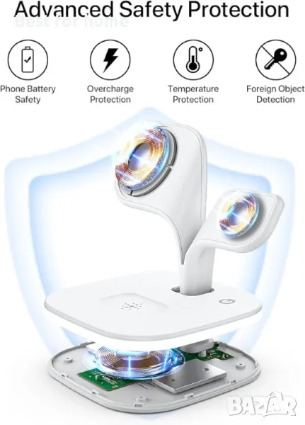 【Безжично зарядно устройство за бързо зареждане】 Изходна мощност на стойката за безопасно зарядно с магнит до 15 W; изходна мощност на слушалки и други устройства 5W; Стандартна изходна мощност на Apple Watch 3 W (Забележка: Препоръчително е входната мощност да бъде 18 W, в противен случай това може да причини недостатъчно зареждане или нестабилно зареждане на множество устройства).