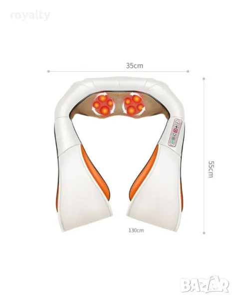 Шиацу 4D масажор за врат, гръб, плешки и рамене с функция затопляне / Дължина на продукта: 39 см; Ширина на активната част: 15,5 см; Височина на активната част: 18 см; Материал: Еко кожа, полиестер; Захранване: 220 V; Тегло: 1.9 кг; Честота: 50 Hz; Ниво на шум: 50 dB; 6 копчета за управление; Две глави с по 2 големи и 4 малки пръстчета; 4 големи и 8 малки пръста; Функция Инфрачервена терапия; Ръчно дистанционно управление.