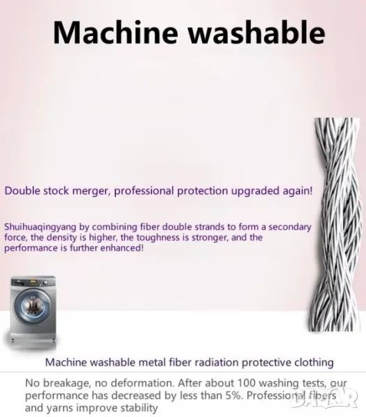 Анализ на тъканта от метални влакна: Изработена от стоманени нишки от неръждаема стомана 316L, извлечена от концентрат, тя е била непрекъснато накисната в морска вода в продължение на 72 часа, за да подобри своята проводимост, устойчивост на солен спрей и устойчивост на корозия, което води до степен на екраниране до 99,9%. Всеки пакет от влакна съдържа множество нишки от влакна, които ефективно екранират високите и ниските честоти, с екранираща производителност до 100GHz. В същото време металните двойни нишки се комбинират, за да образуват вторична сила и се подлагат на хиляди експерименти за огъване всеки ден, за да се подобри здравината на металните влакна. След серия от сложни процеси, той се смесва с 50% чист памук, за да се получат 32 нишки с висока прежда, което прави целия сноп от влакна по-удобен и стабилен в изпълнение. Има дълготрайна защита, устойчивост на износване, устойчивост на пране, може да се пере в пералня и плътно приляга.