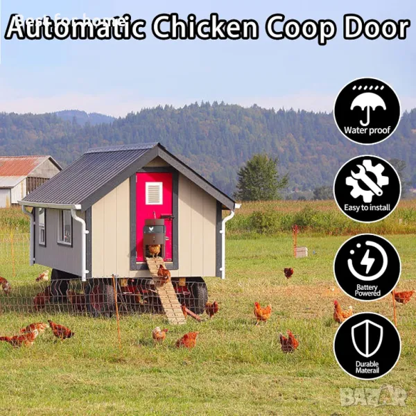 кокошарник, автоматична врата за пилета със сензор за светлина, включва плъзгач с водещи релси, безопасно отглеждане на пилета
