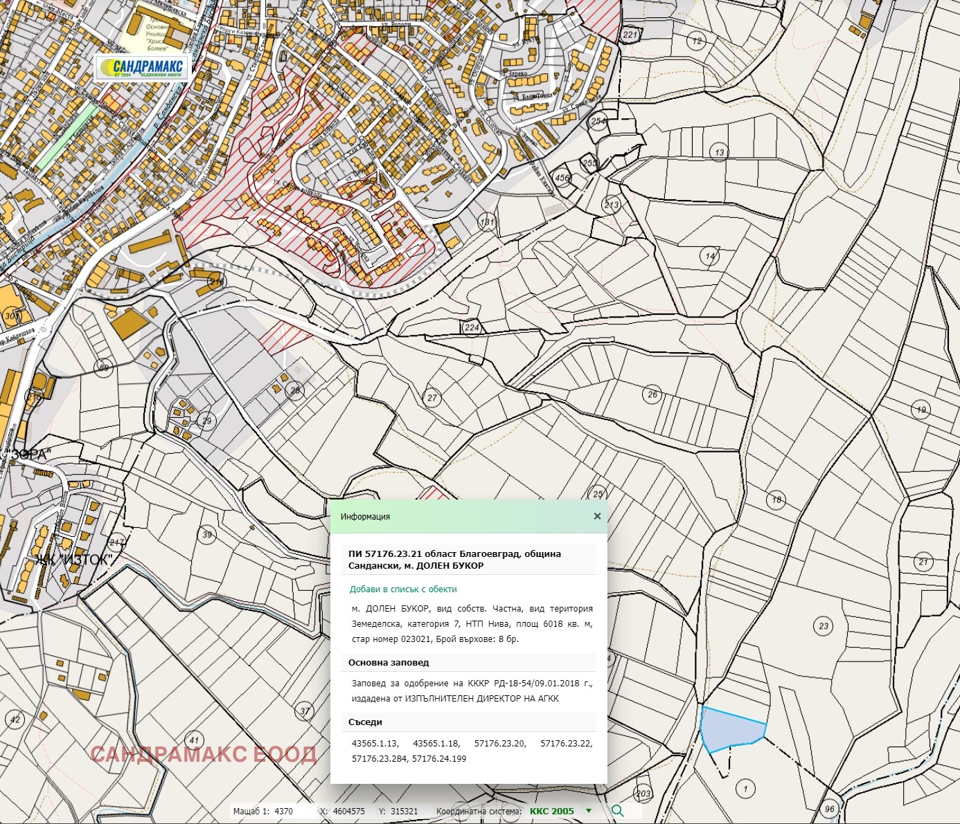 САНДРАМАКС продава земеделска земя в южната територия на гр. Сандански, с. Поленица , местност 'Долен Букор'.