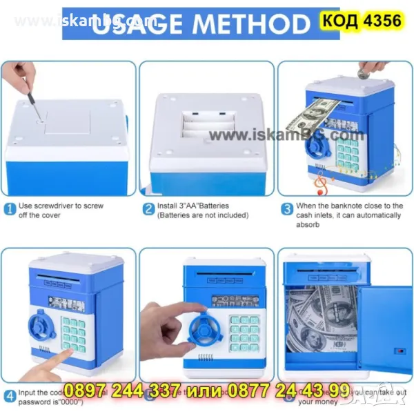 Сейфът е оборудван със специален четирицифрен код, който може да бъде персонализиран, осигурявайки защита на натрупаните спестявания. Внасянето на банкноти става автоматично, като те се изтеглят през специален слот – точно като при истински банкомат.