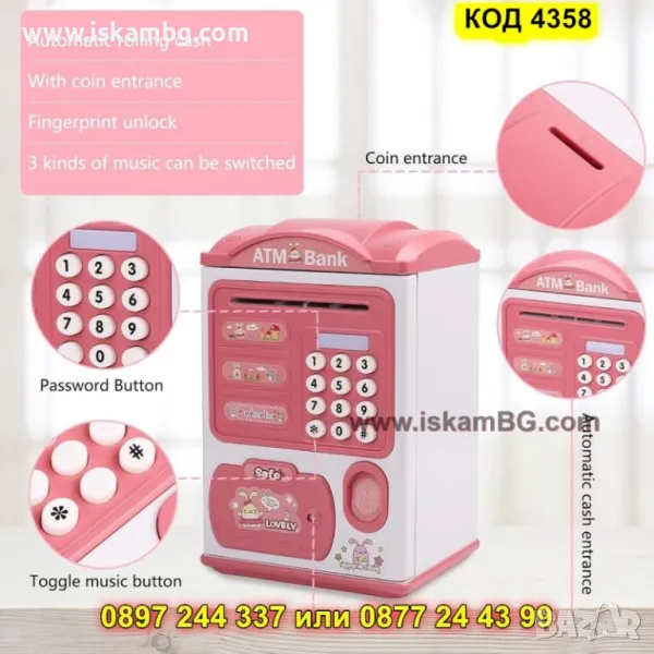 Сейфът е снабден с четирицифрен ПИН код, който детето може да персонализира, осигурявайки пълен контрол върху своите спестявания. Реалистичният дизайн, наподобяващ истински банкомат, въвежда децата в света на финансите и ги учи на основите на управление на парите.