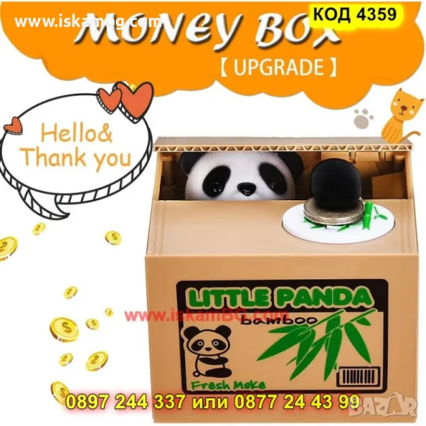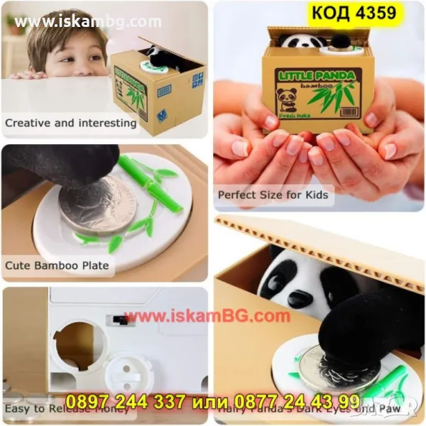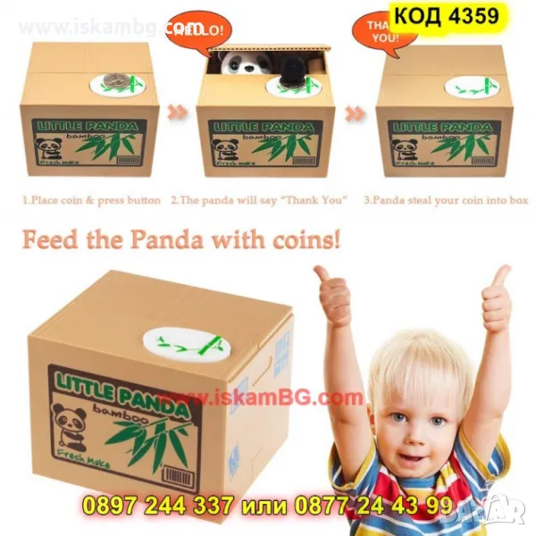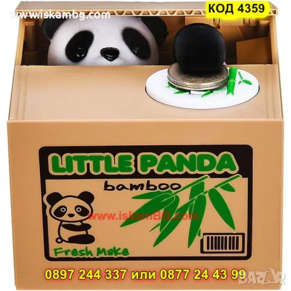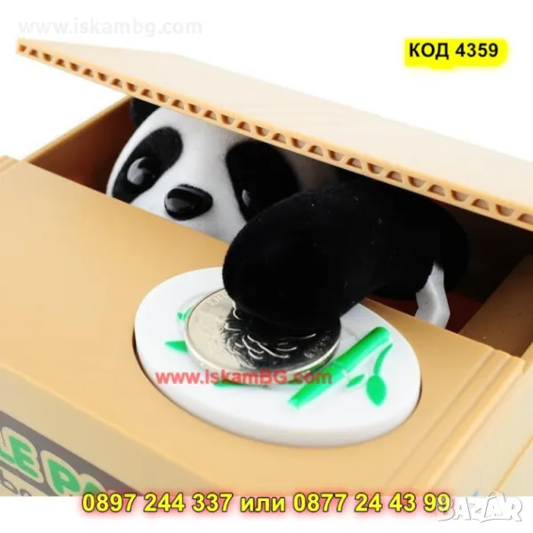 Очарователна и весела касичка, която ще накара всяко дете да се влюби в спестяването! Поставете монета върху специалната чинийка и гледайте как пандата тайно се показва, взима я с лапичка и весело ви „благодари“.