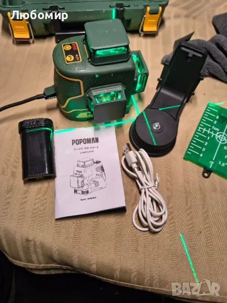 Лазерен нивелир 3D & 3 x 360°, Линеен лазерен зелен POPOMAN, USB акумулатор, самонивелиращ