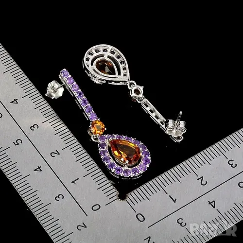 925 сребърни обеци с цитрис 9х6мм, лице 38.0 X 12.0 MM, тегло 5гр. произход Бразилия. Другите камъни са аметист. Цена 130лв.