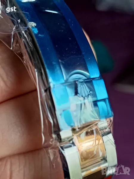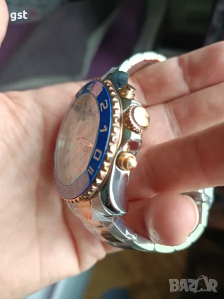 Керамичен ринг който се върти по скалата на Gmt 10ч. Напред и назад Без хронограф тази версия (с реален хронограф са над 1к.) малката стрелка на секундата само от долният бутон се движи,горният бутон движи Gmt.но и двата бутона са активни на резба с заключване