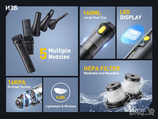 【14000Pa високомощно засмукване】 Високоскоростният безчетков мотор осигурява силна засмукваща сила от 100AW / 14000Pa, което улеснява събирането на упорит пясък, прах и отломки. Прахосмукачката за кола Auxito подобрява засмукването със 75%, като перфектно се справя с притесненията ви относно засмукването.【30 минути дълга издръжливост】 Безжичната прахосмукачка за кола на Auxito е с вградени 3 броя 2000mAh литиеви батерии, с изключително дълъг обхват до 30 минути. Той може лесно да разреши безпокойството за обхват и да отговори на вашите дългосрочни нужди от употреба. Гарантиране на качеството, стабилност и надеждност, което ви позволява да използвате спокойно.【Ръчна и безжична】 Мини прахосмукачката за кола AUXITO тежи само 1 паунд и разполага с ръчен и безжичен дизайн, което ви позволява лесно да боравите с пясък, прах и отломки от всеки ъгъл на колата с една ръка. Предоставяме чанта за съхранение, която е готова за употреба, което я прави удобна за използване и съхранение.【МОЩНО ВСМУКВАНЕ И НИСЪК ШУМ】Ръчната прахосмукачка е оборудвана с мощен високоскоростен мотор, със скорост до 60 000 RPM и налягане на вятъра до 14 000 Pa, произведеният звук е по-малък от 85 dB. Мощното засмукване ви помага бързо да завършите работата си по почистване. С дълготрайна всмукателна мощност, прахосмукачката лесно премахва прах, трохи, пясък, косми от домашни любимци и т.н., ефективно почиства бъркотията и ви осигурява чисто и подредено пространство. Ново поколение модернизирани въздуховоди, удобни и ниски нива на шум правят живота по-лесен.【