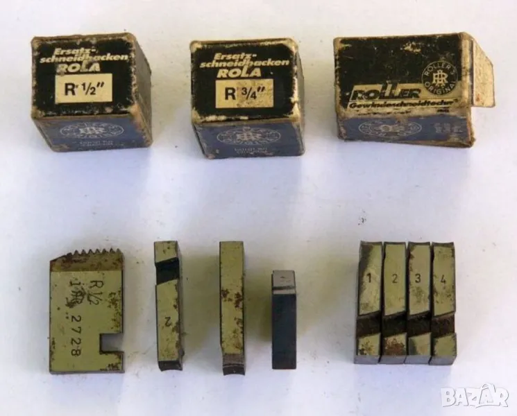 Налични още нови Райбери, Въртоци и Метчици Плашки (метрични 60 градуса и цолови инчови - английски британски стандарт Витворт Whitworth 55 градуса BSW BSF тръбна резба G/BSP и др., американски стандарти UTS 60 градуса UNC UNF NPT и др.), к-ти ножчета Ножове 1/2“ половин цол и 3/4“ цола за Винтонарезка винторезка винторез винтонарезна резбонарезна машина пафта плашка за тръби, листове острие ръчна и машинна Ножовка, Свредла с конусна опашка, патронник Универсал с челюсти за струг, Накатки и др.(вижте обяви). • АРТИКУЛ: Немски Професионален Комплект НОЖОВЕ Резбонарезни с канали за цолова Витвортова тръбна резба 55 градуса R / BSPT - Резервни Части за инструменти винтонарезна глава дъска резбонарезна машина винторез с тресчотка; (Vintage Original ROLLER Ersatz-Schneidbacken Gewindeschneidbacken ROLA R1/2” R3/4” DIN 2999 konisch NOS);